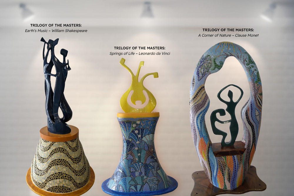 LEFT: EARTH‘S MUSIC - “The earth has music for those who listen” – WILLIAM SHAKESPEARE | DESCRIPTION: Mosaic patterns create the illusion of melodic ripples of sound waves soaring upward from the earth inviting the graceful, elongated figures above to burst into a medley of song and dance to the music of nature‘s orchestra. SIZE: 74” tall, 500 lbs. | CENTER: SPRINGS OF LIFE - “Water is the driving force of all nature.” – LEONARDO DA VINCI | DESCRIPTION: The story begins at the mosaic base, where an abundance of water flows upwards from the earth, replenishing nature and life. SIZE: 70” tall, 430 lbs. | RIGHT: A CORNER OF NATURE - “My wish is to stay always like this, living quietly in a corner of nature.” – CLAUDE MONET | DESCRIPTION: Intricate mosaic designs surround the figures, creating a quiet corner of nature with the sun's rays reaching out towards the swaying branches and graceful life on the canopy. SIZE: 76” tall, 350 lbs. | PRICE: $135,000 for all.